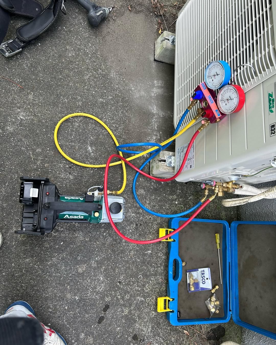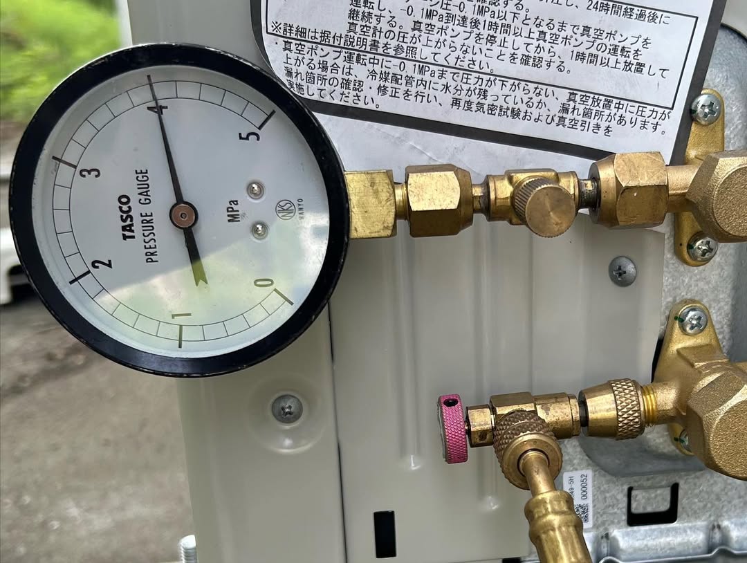 既存機器を丁寧に撤去した後、新しい高性能な機種を設置。施工品質を確保するため、冷媒配管の接続完了後には、漏れがないかを厳格にチェックする気密試験(耐圧試験)を実施しました。